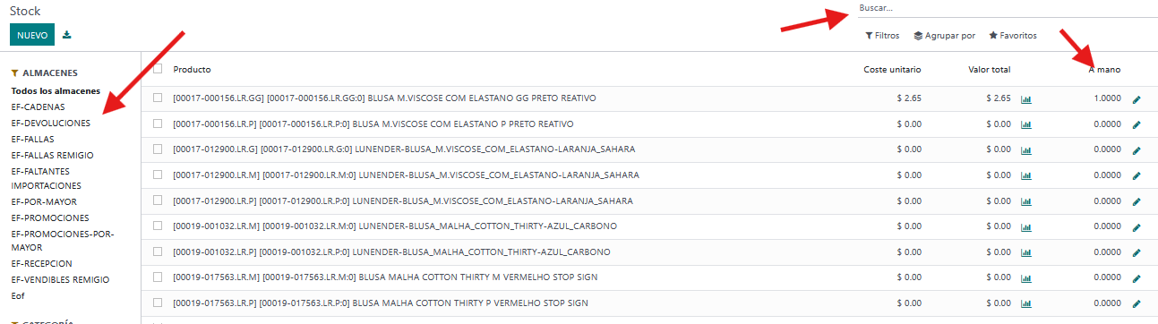 2. Le muestra a la izquierda las bodegas disponibles y los productos en cada bodega, escribir en la barra de busqueda el producto que necesita y verificar la columna "A mano"