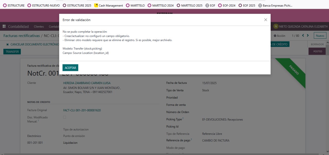 El siguiente error es ocasionado porque en la nota de credito, el campo Picking Type siempre debe estar establecido como NombreBodega-Devoluciones.